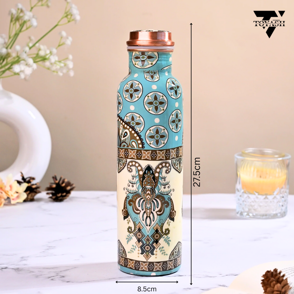 TOYASH 100% Pure Copper Water Bottle 1 Ltr Copper Water Bottle with Glass Set Meena Prints Leak-Proof & Insulated 2 Water Glass 300ml each Best for Gifting-Sky Blue Print