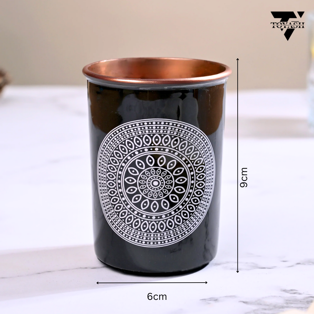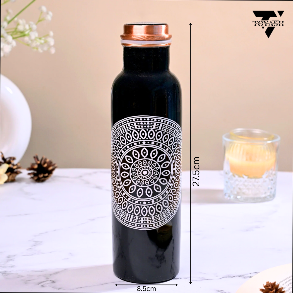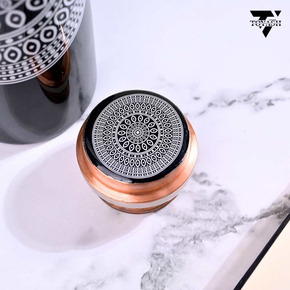 TOYASH 100% Pure Copper Water Bottle 1 Ltr Copper Water Bottle with Glass Set Meena Prints Leak-Proof & Insulated 2 Water Glass 300ml each Best for Gifting-Black Print