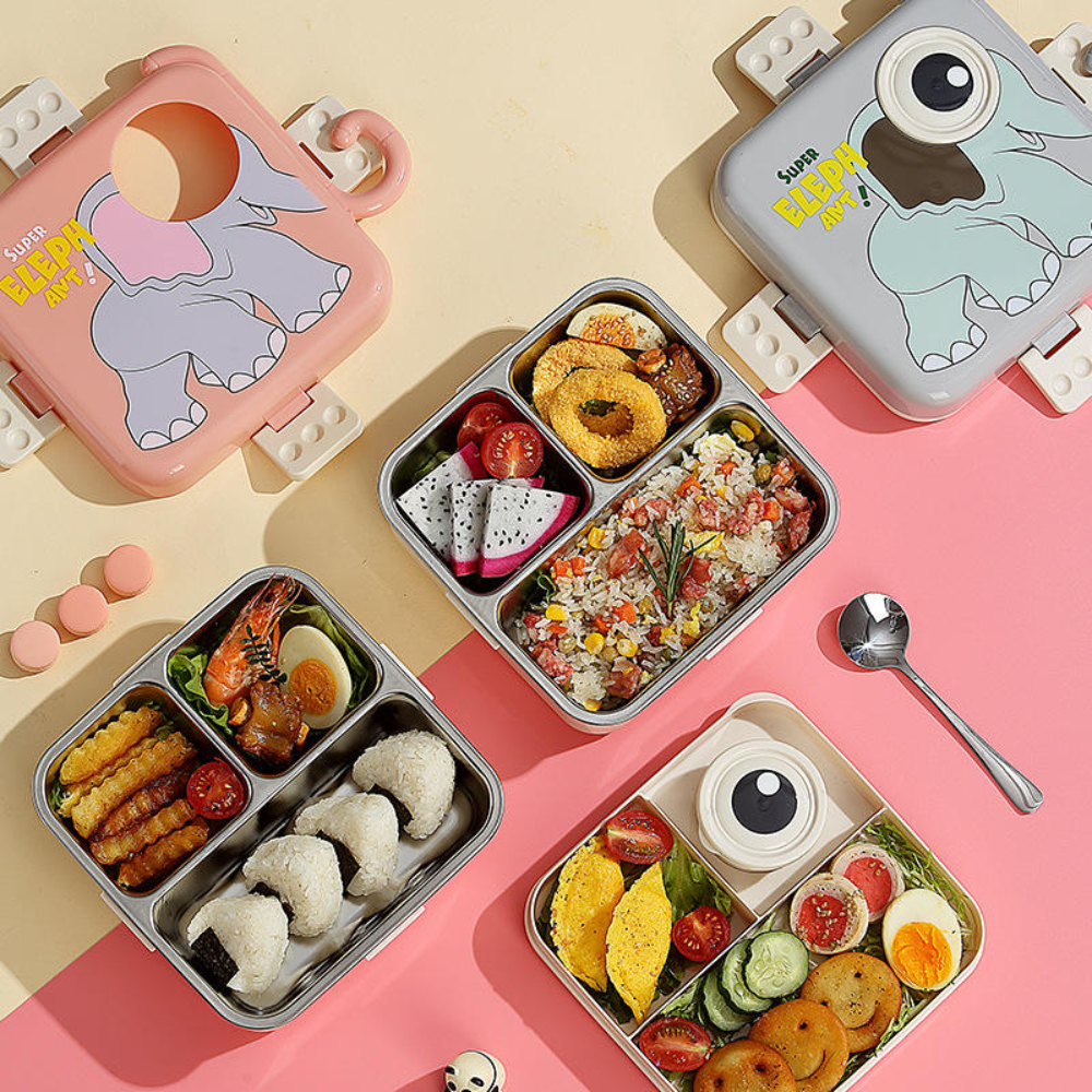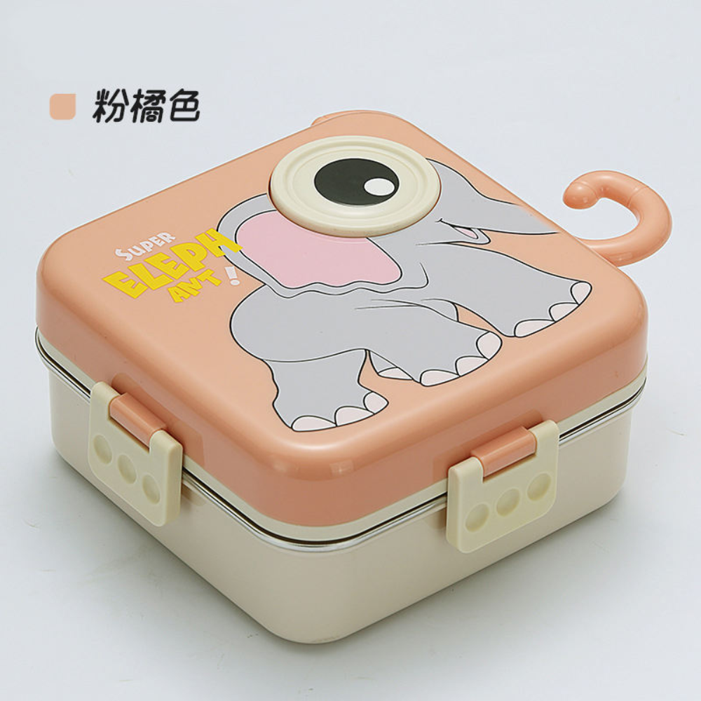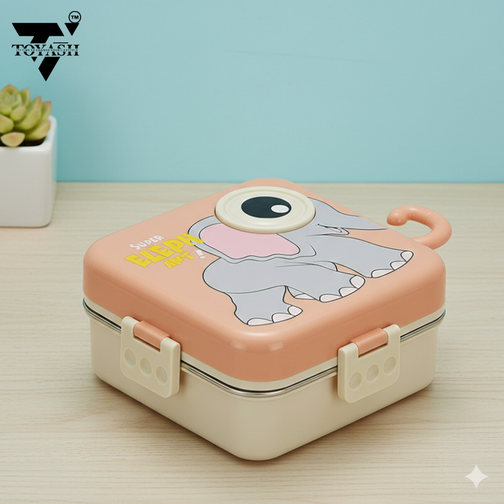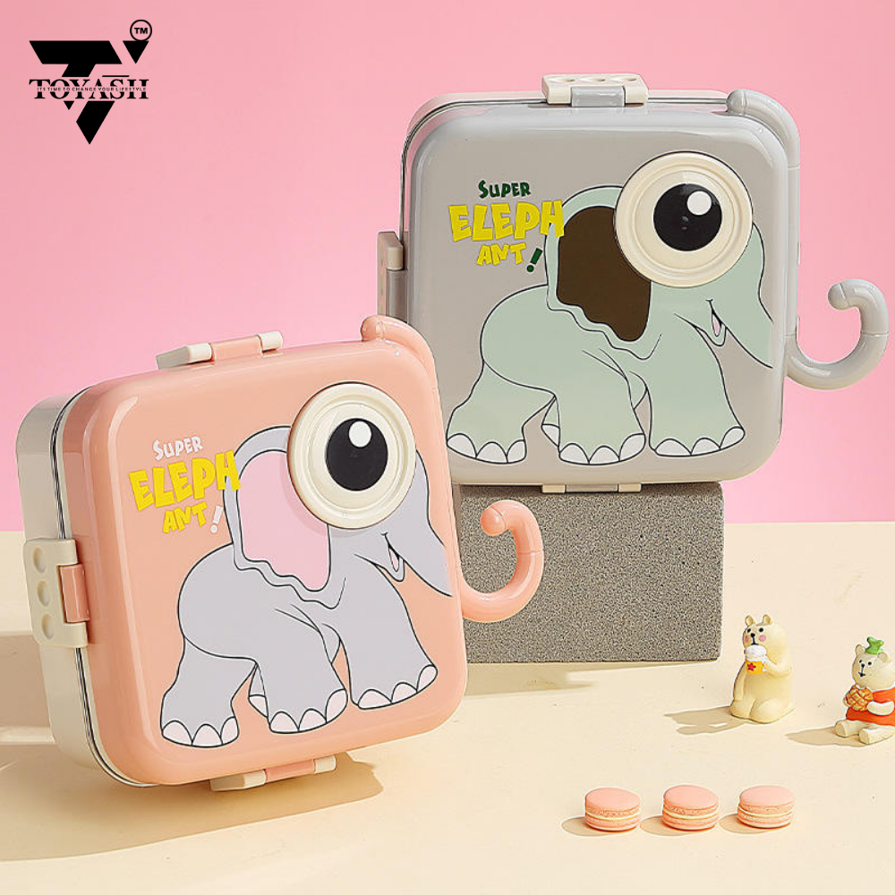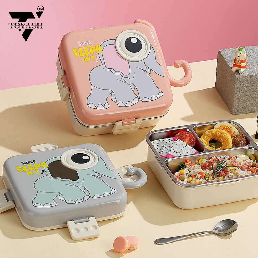 TOYASH Carnival Super Elephant Lunch Box 2 Layer Stainless Steel Lunch Box Comes with 1 Detachable Tray, 1 Small Container & 1 Spoon Ideal for Kids BPA Free 1120ml+70ml (3 Compartment)