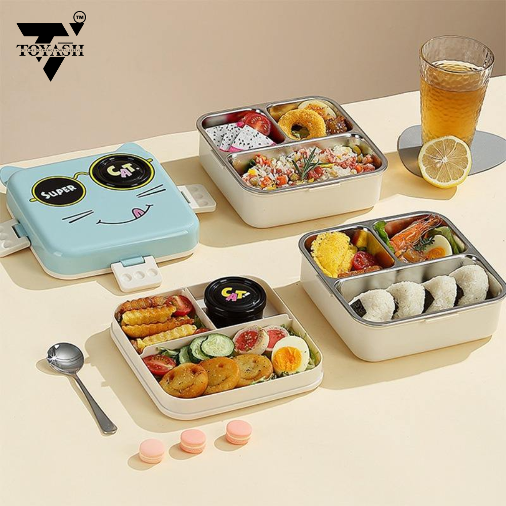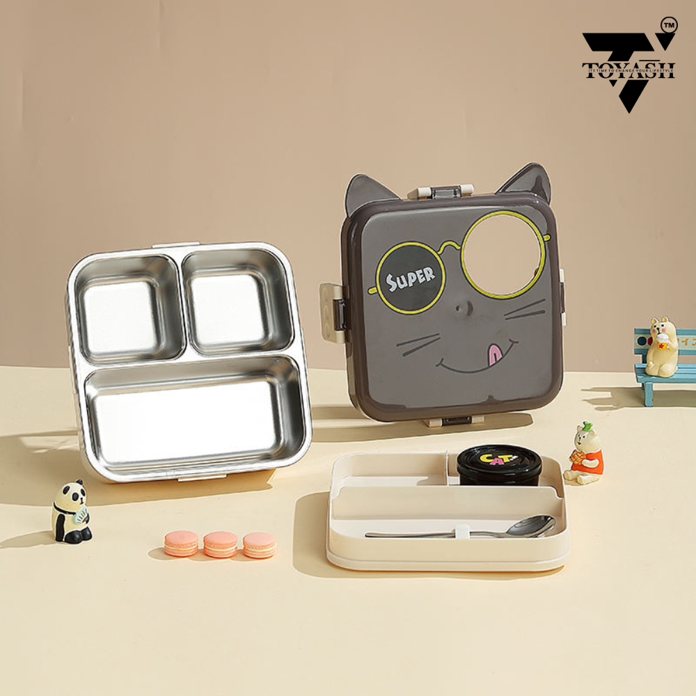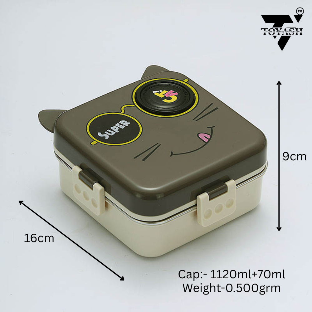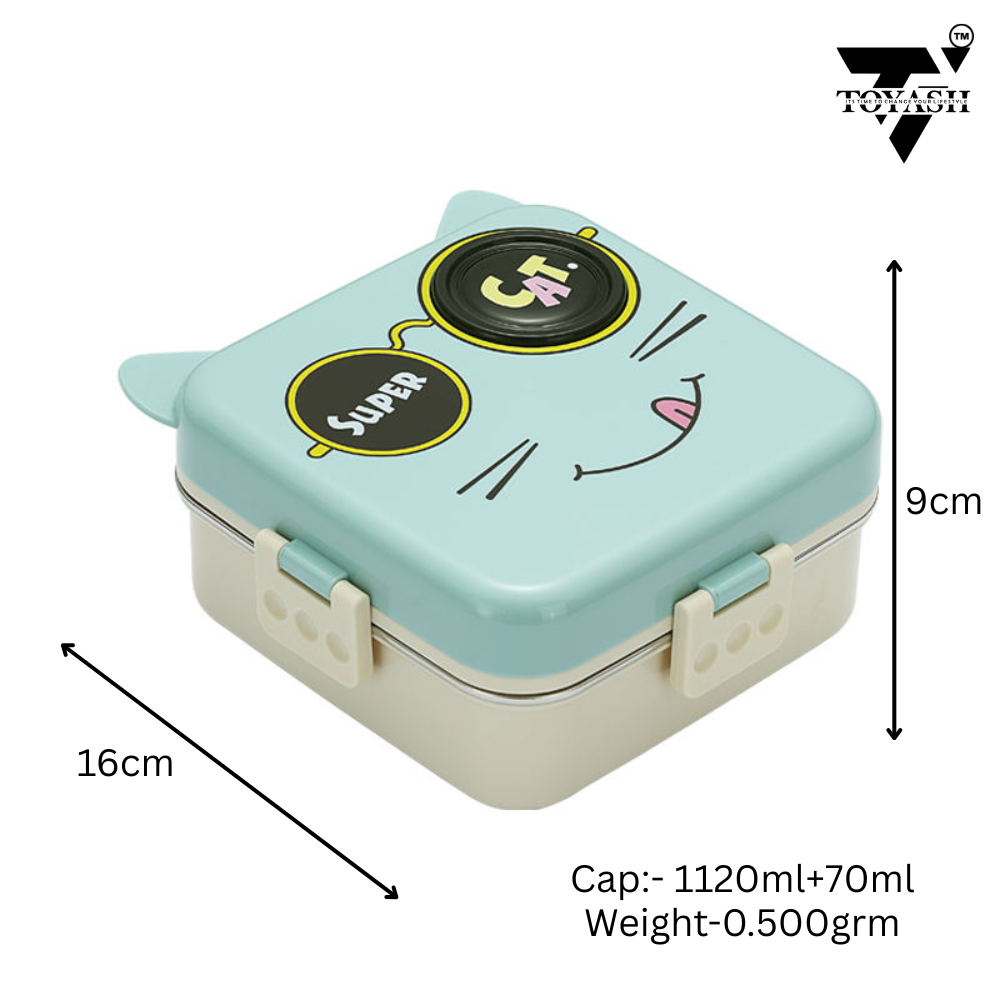 TOYASH Super Cat Lunch Box 2 Layer Stainless Steel Lunch Box Comes with 1 Detachable Tray, 1 Small Container & 1 Spoon Ideal for Kids BPA Free 1120ml+70ml (3 Compartment)
